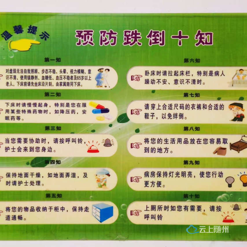 科室针对重点防跌倒患者,在住院一览表、床头卡,以及腕带上均贴有重点防跌倒人群标识,并在每个病房贴有预防跌倒“十知温馨提示”,病房洗手间设置人性化辅助设施,护理人员会根据患者情况动态评估和管理患者跌倒风险等级。夜间为了兼顾患者睡眠和入厕需求,科室在床下贴心设置夜灯,守护患者安心睡眠。