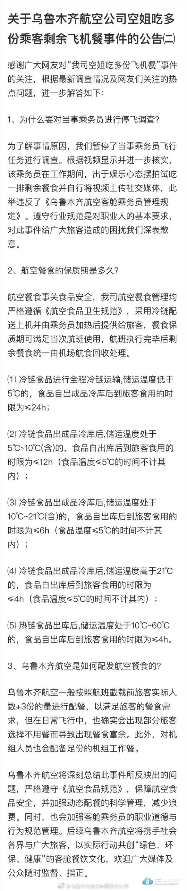 @乌鲁木齐航空有限责任公司12月8日凌晨再次就空姐吃多份乘客剩余飞机餐事件发布公告。