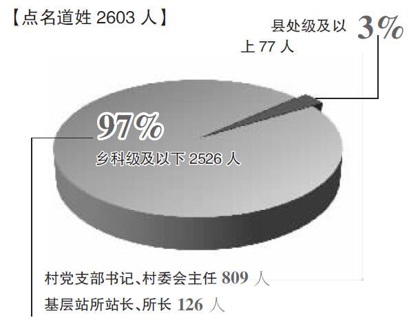 在被曝光的2603人中,县处级及以上人员77人,占3%;乡科级及以下2526人,占97%。村党支部书记、村委会主任809人,占总人数31.1%;基层站所站长、所长126人,占总人数4.8%。