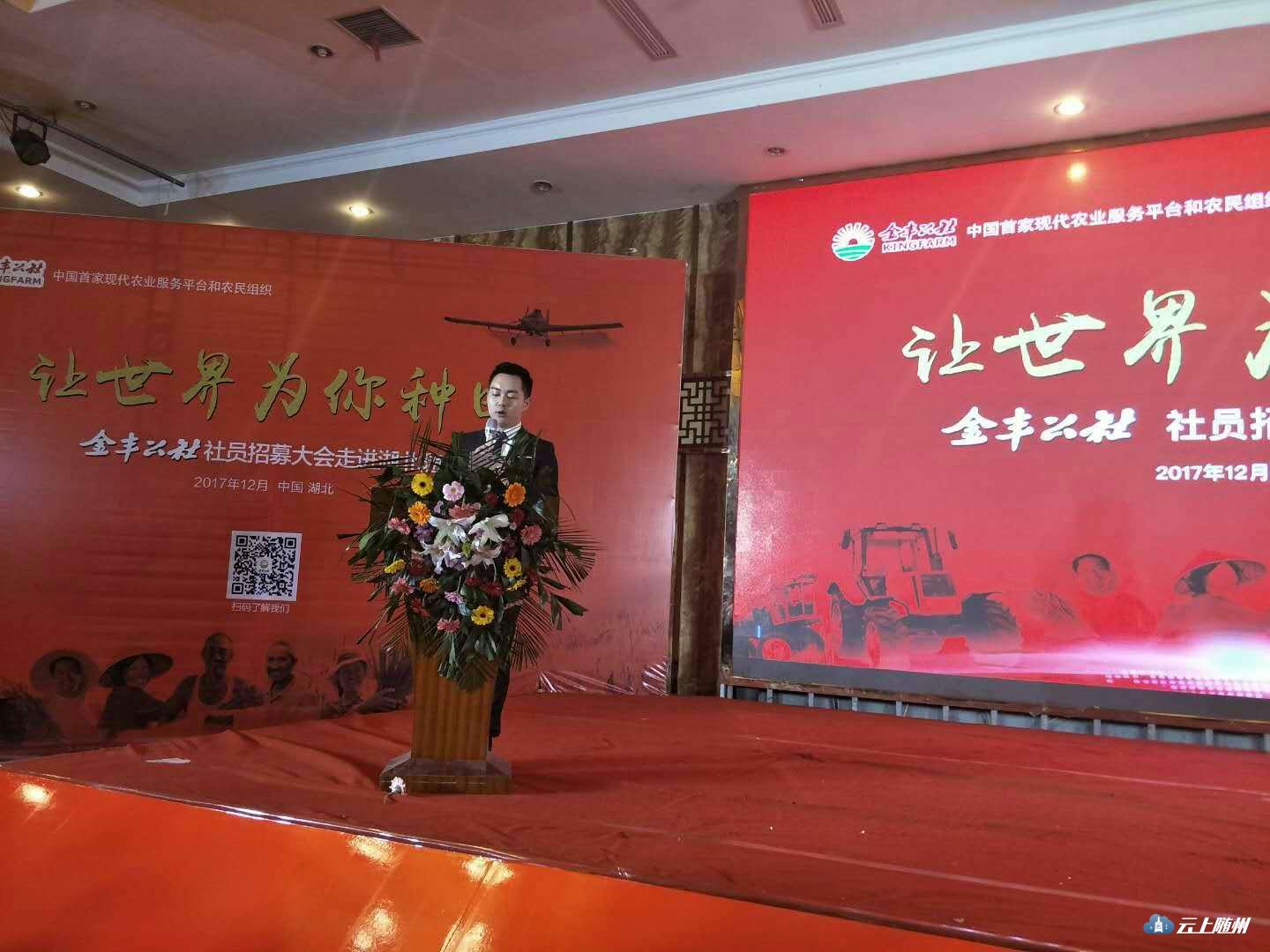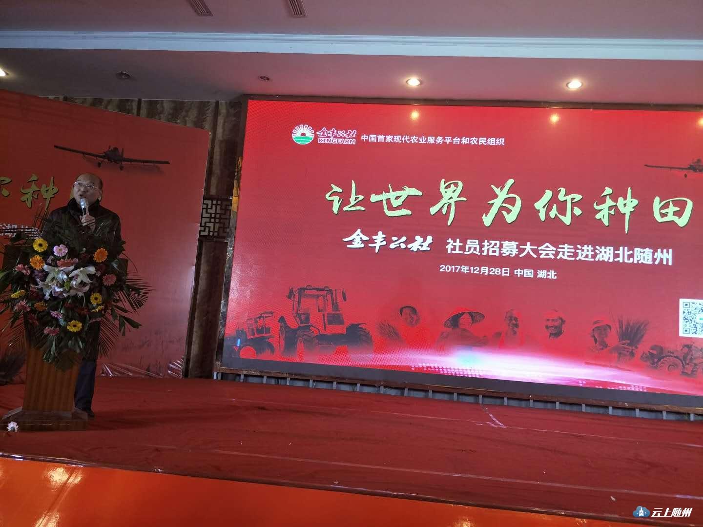 12月28日,随州第一家现代农业服务平台和农民组织-金丰公社正式挂牌成立,该组织致力于为种植业户机播手代种代收,农机具销售租赁,全程作物营养解决,土壤修复,农产品品牌打造和品质提升,农技培训指导,产销对接和农业金融等全方位的农业服务,参会农业种植机械大户800多人。