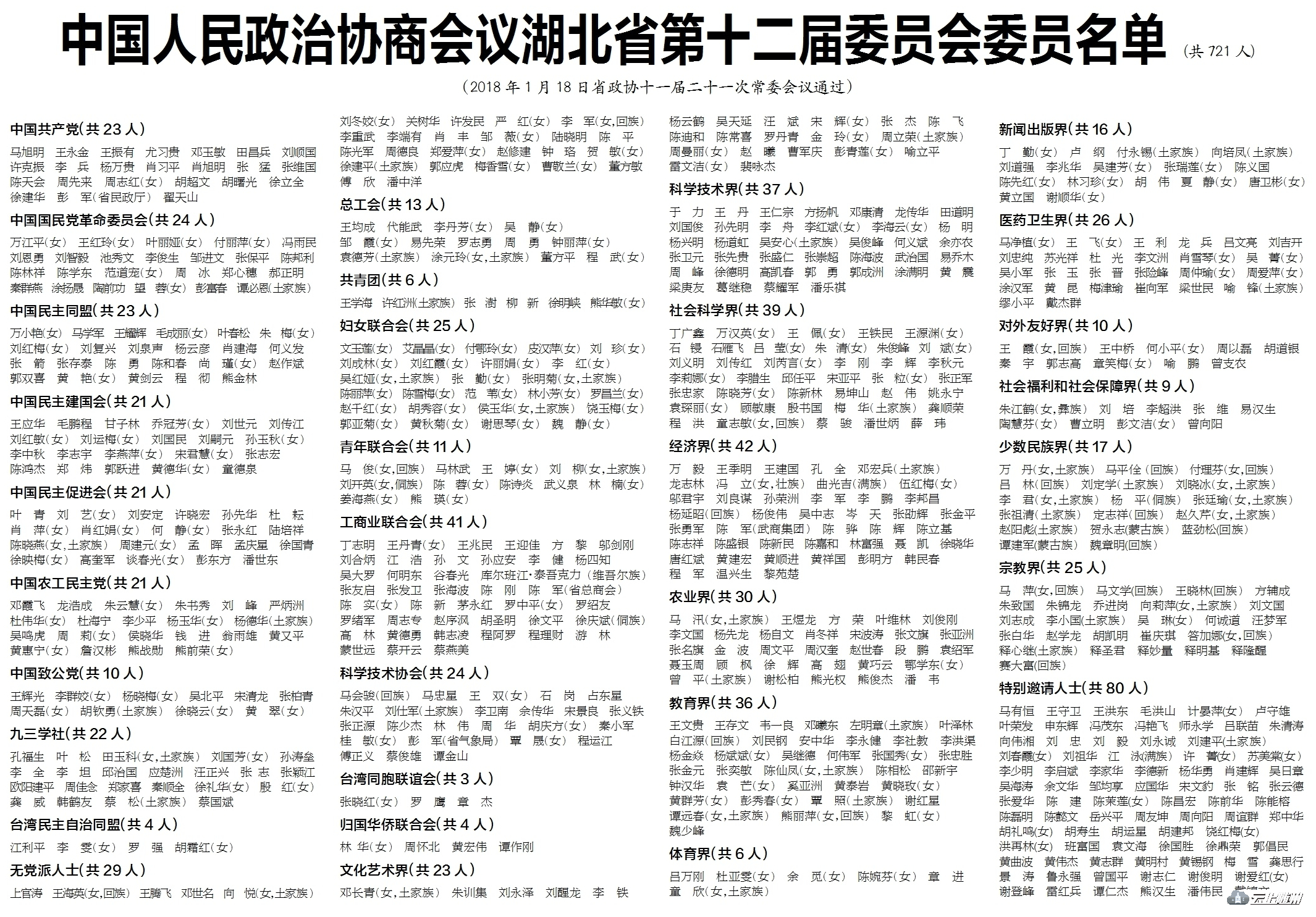 中国人民政治协商会议湖北省第十二届委员会委员名单(共721人)