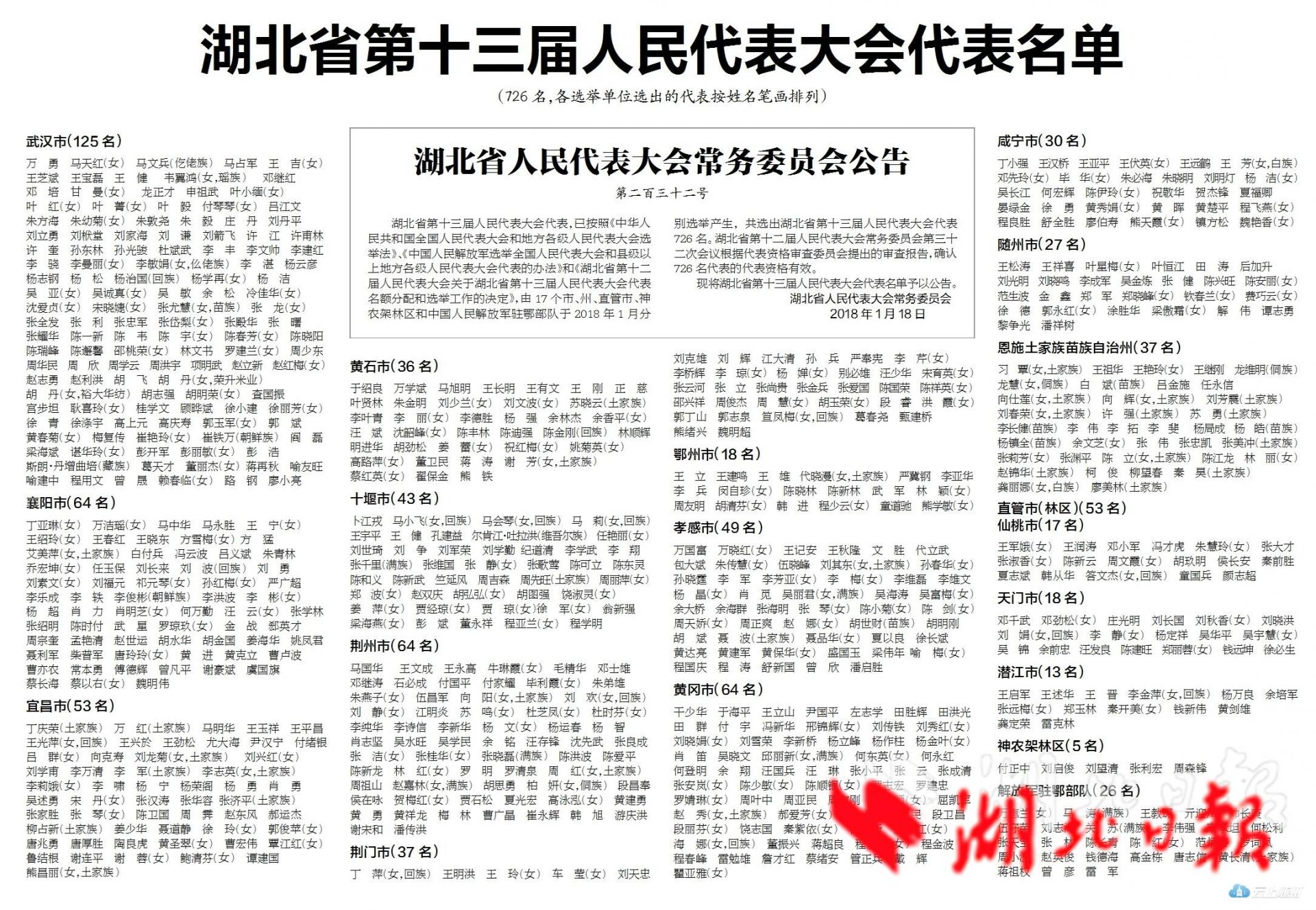 湖北日报讯 湖北省第十三届人民代表大会代表,已按照《中华人民共和国全国人民代表大会和地方各级人民代表大会选举法》、《中国人民解放军选举全国人民代表大会和县级以上地方各级人民代表大会代表的办法》和《湖北省第十二届人民代表大会关于湖北省第十三届人民代表大会代表名额分配和选举工作的决定》,由17个市、州、直管市、神农架林区和中国人民解放军驻鄂部队于2018年1月分别选举产生,共选出湖北省第十三届人民代表大会代表726名。湖北省第十二届人民代表大会常务委员会第三十二次会议根据代表资格审查委员会提出的审查报告,确认726名代表的代表资格有效。