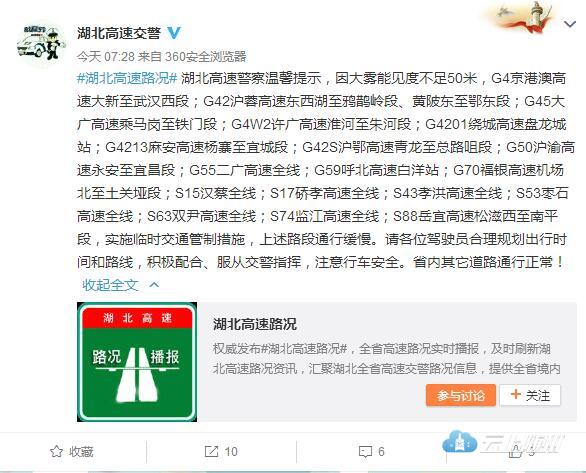 #湖北高速路况#湖北高速警察温馨提示,因大雾能见度不足50米,G4京港澳高速大新至武汉西段;G42沪蓉高速东西湖至鸦鹊岭段、黄陂东至鄂东段;G45大广高速乘马岗至铁门段;G4W2许广高速淮河至朱河段;G4201绕城高速盘龙城站;G4213麻安高速杨寨至宜城段;G42S沪鄂高速青龙至总路咀段;G50沪渝高速永安至宜昌段;G55二广高速全线;G59呼北高速白洋站;G70福银高速机场北至土关垭段;S15汉蔡全线;S17硚孝高速全线;S43孝洪高速全线;S53枣石高速全线;S63双尹高速全线;S74监江高速全线;S88岳宜高速松滋西至南平段 ,实施临时交通管制措施,上述路段通行缓慢。请各位驾驶员合理规划出行时间和路线,积极配合、服从交警指挥,注意行车安全。省内其它道路通行正常!
