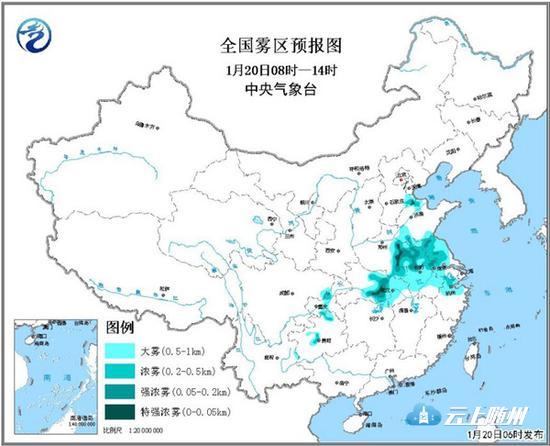 中国天气网讯中央气象台1月20日06时继续发布大雾黄色预警: