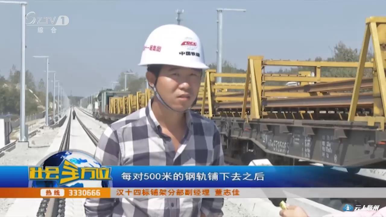 【采访】汉十四标铺架分部副经理 董志佳:我们这个运输车每天装轨24根,一根钢轨是500米,我们两根钢轨属于一对轨,铺下500米,整个钢轨运输车再往前走500米,继续铺500米,再走500米,每天是六公里的工作,我们这个工作效率还是比较高的。