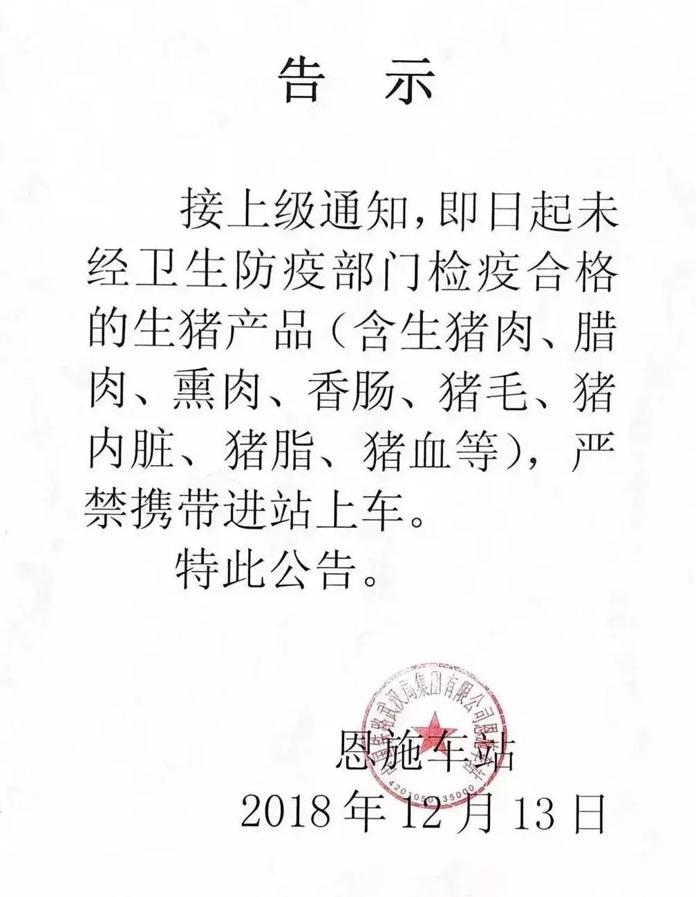 据武铁宜昌车务段恩施车站消息,为了进一步加强客运系统非洲猪瘟防控,恩施车站接上级通知,12月13日起,未经卫生防疫部门检疫合格的生猪产品严禁携带上火车。