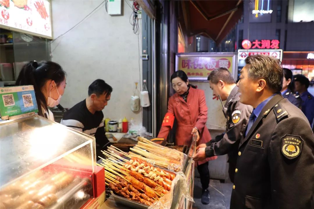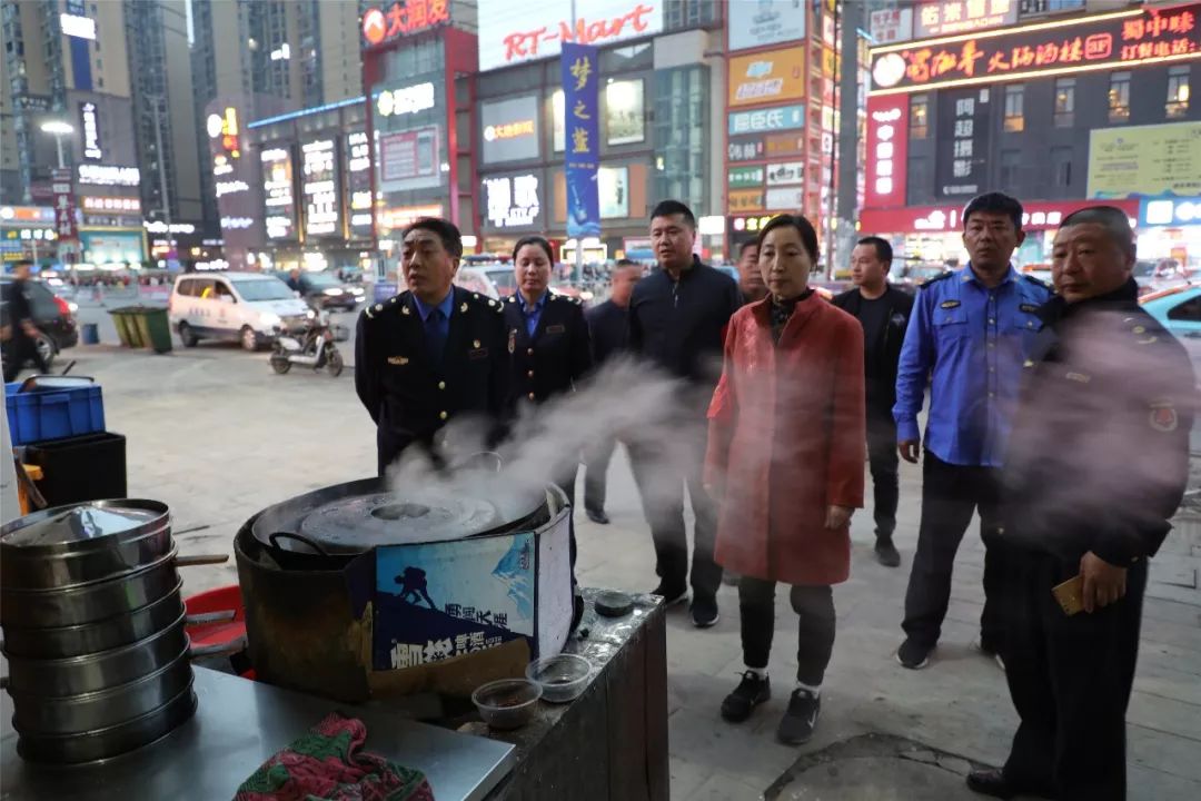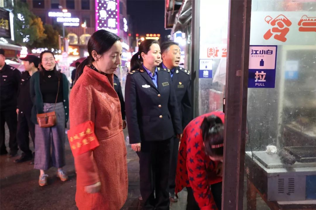 小十字街美食街也是夜市整治行动必看之处。看完大润发,汪冬梅坐着巡逻车,“转战”小十字街,挨家挨户检查、劝导。