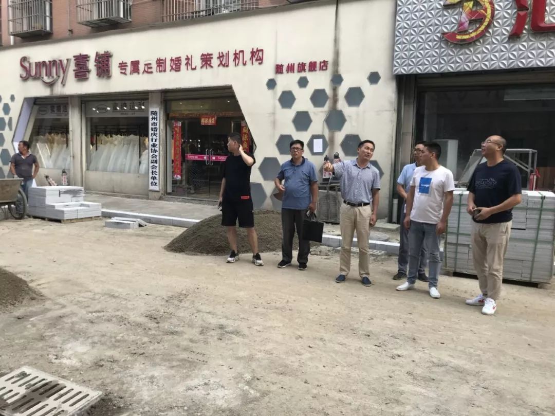 9月3日,东城办事处主任高国新、副主任黄祖军在香港南街、聚玉街东段现场督导,查看背街小巷改造的相关进度。