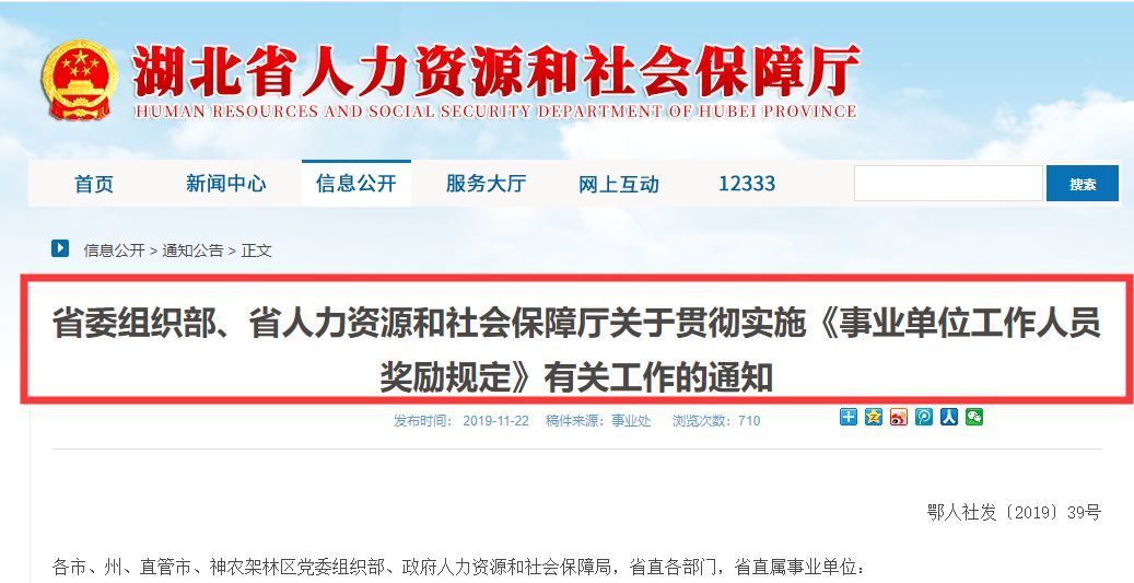 11月25日获悉,为贯彻落实《事业单位工作人员奖励规定》,中共湖北省委组织部、省人社厅联合印发了《关于贯彻实施事业单位工作人员奖励规定有关工作的通知》(以下简称《通知》),明确了奖励措施、实施程序、奖金标准等。