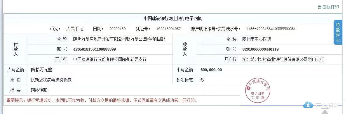 据了解新万基地产,响应国家及党的号召,向随州市中心医院捐赠爱心疫款60万元,为随州市中心医院购置急需医疗物品,彰显企业担当的责任。