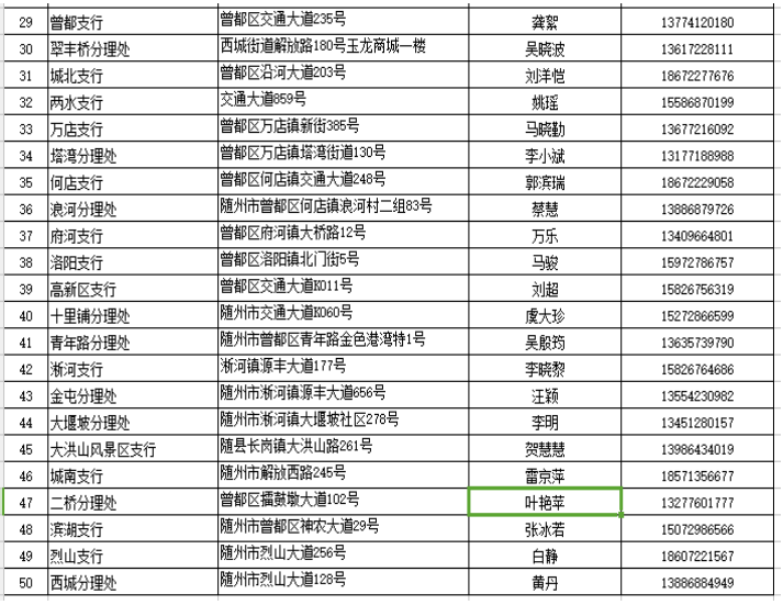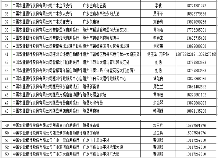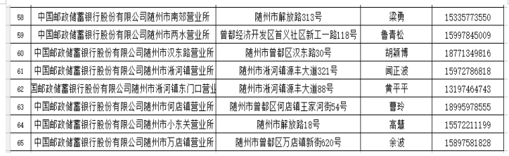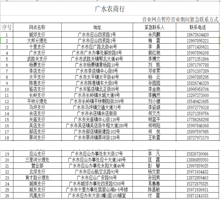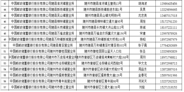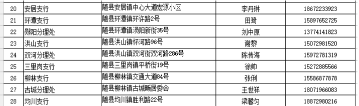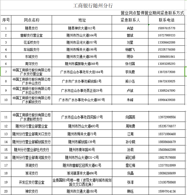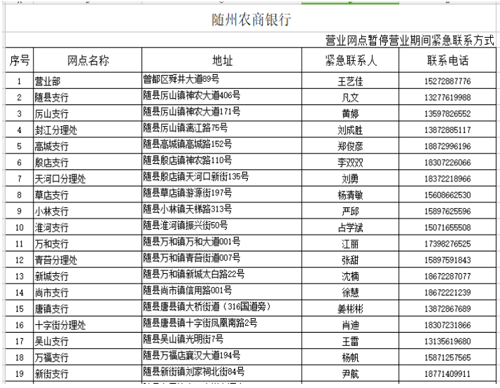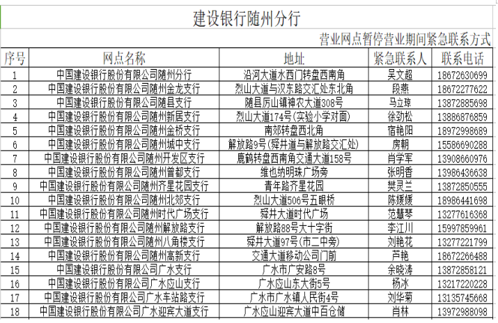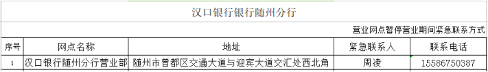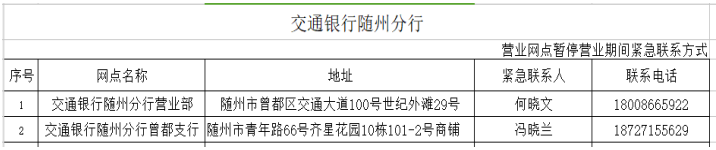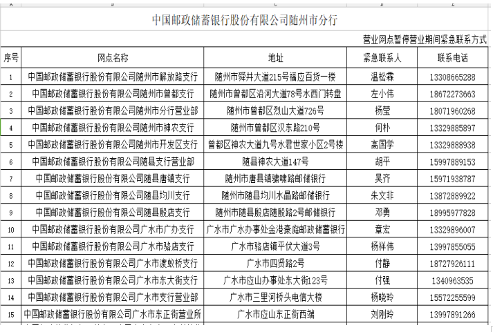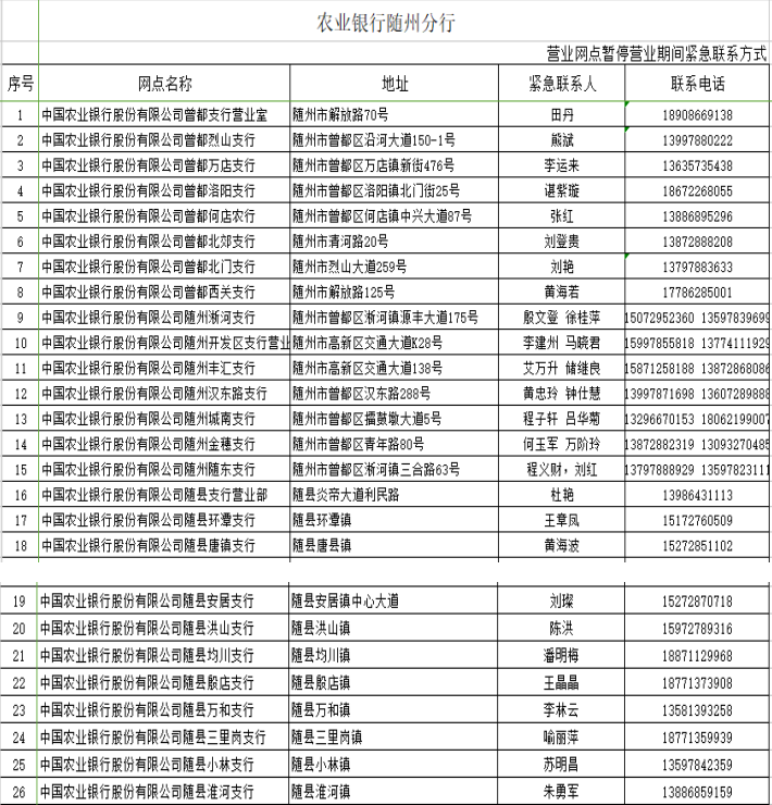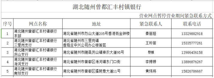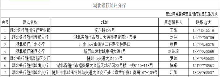 在疫情防控期间,为了尽可能满足广大人民群众存取款需求,人民银行随州市中心支行组织辖内金融机构设立了存取款紧急联系人。现将联系人及电话予以公布,广大居民如有现金存取款业务可直按拨打电话咨询并接受社会监督。