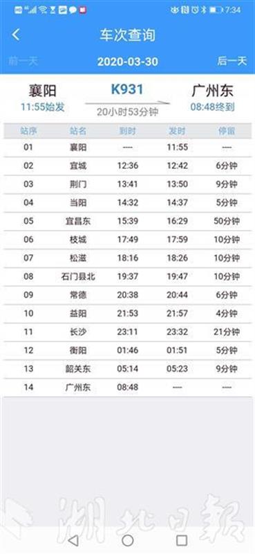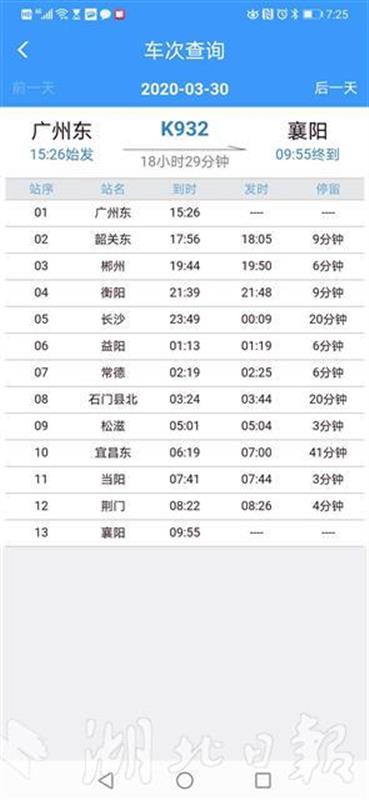 记者查询发现,广州东开K936次经过湖北松滋、荆门、宜城、襄阳等站;广州东开K932次经过湖北松滋、宜昌东、当阳、荆门、襄阳等站;深圳东开K93/2次次经过湖北黄梅火车站;襄阳开K931/4/1次经过湖北襄阳、宜城、荆门、当阳、枝城、松滋等站。