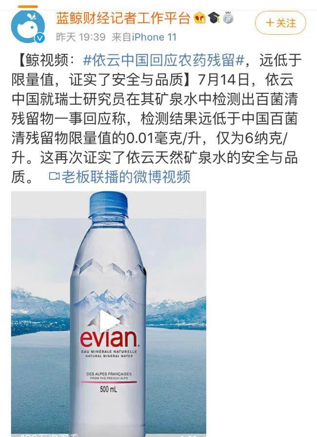昨天,依云中国就瑞士研究员在其矿泉水中检测出百菌清残留物一事回应:检测结果远低于中国百菌清残留物限量值的0.01毫克/升,仅为6纳克/升。