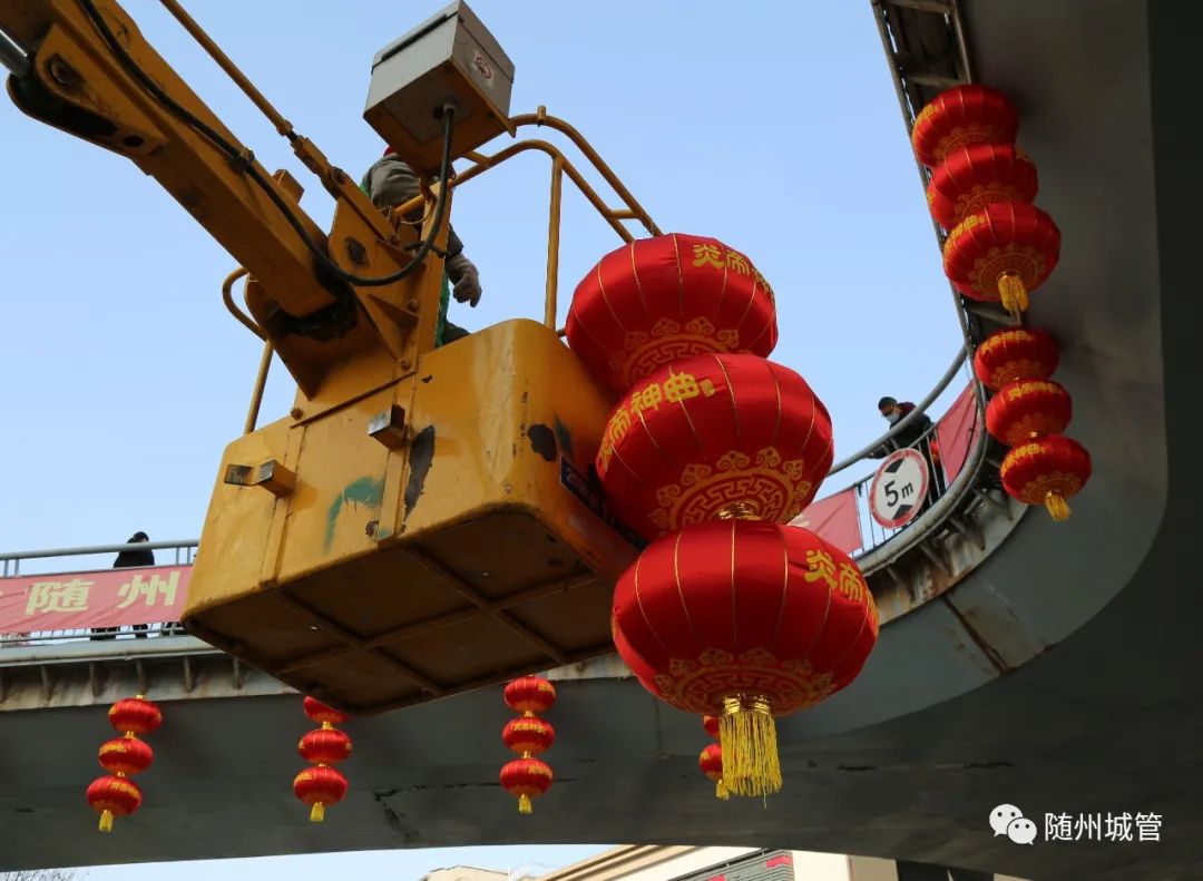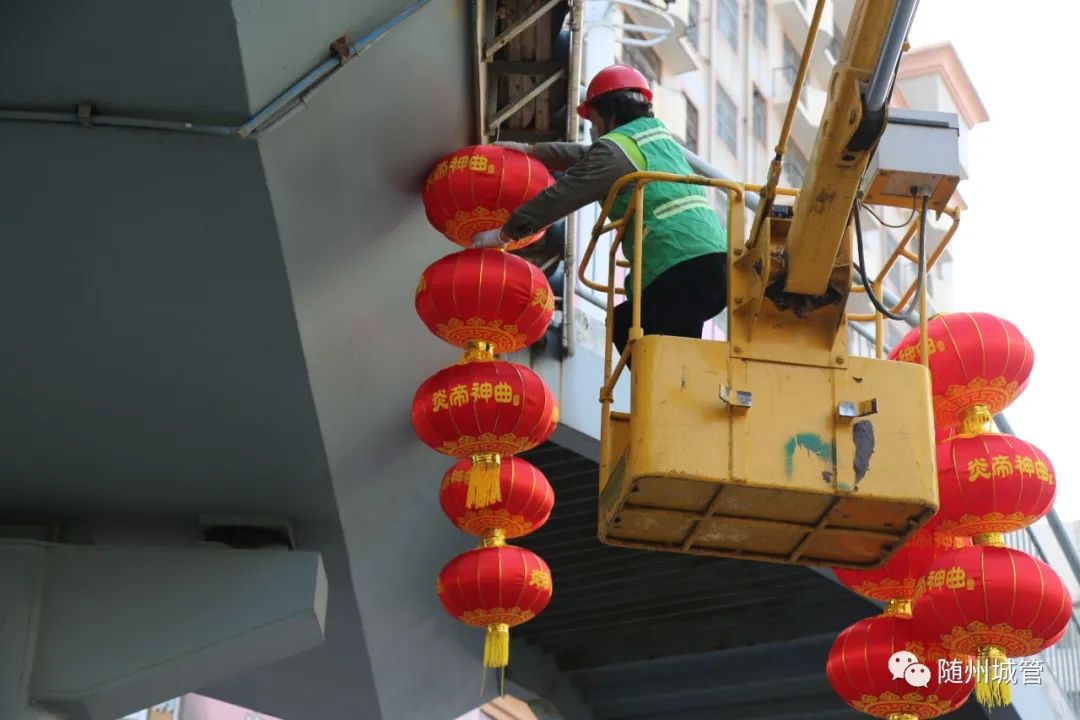 1月28日,阳光明媚,在随城大十字街天桥下,市绿化管理处的工作人员正站在升降机上,有条不紊地悬挂一串串大红的灯笼……