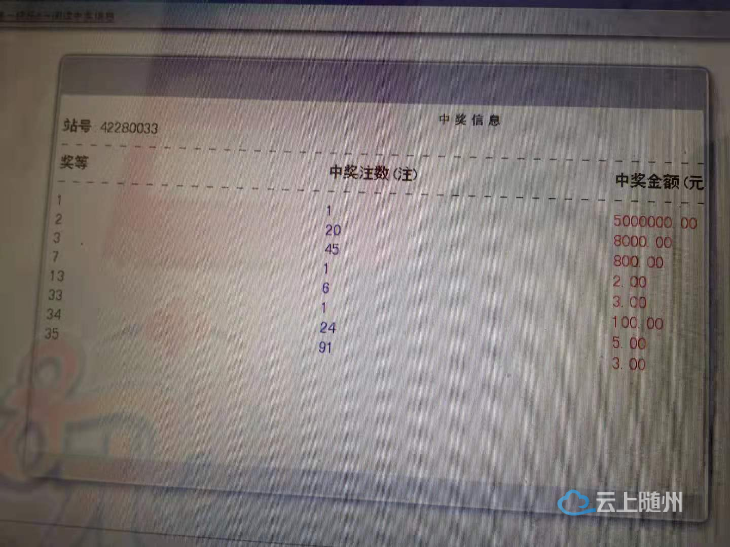 【采访】店主 谢训国:他是花了132块钱买的复式选十、十二码的复式票,结果兑了10个号,开奖之后一个一等奖500万元,还有兑9个号,相当于选十的二等奖8000元有20个,选十的三等奖兑45个800元,总共奖金是519.6万元。
