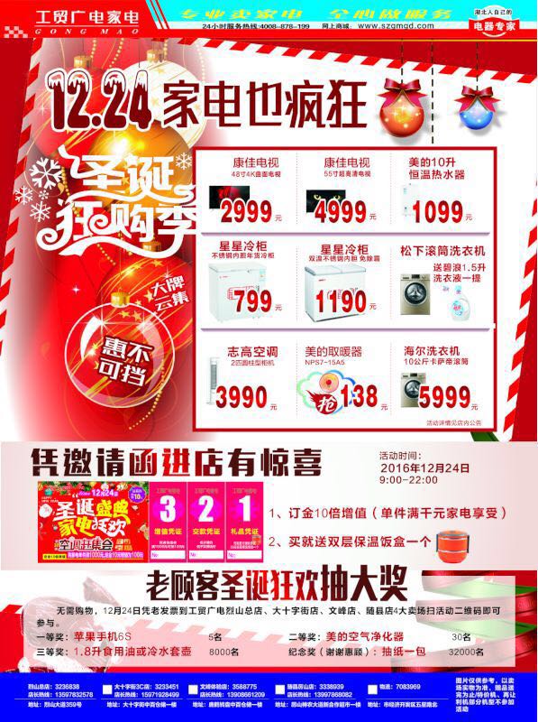 3、老顾客圣诞抽大奖 。无需购物,12.24日到工贸广电各卖场扫描全省圣诞抽奖活动二维码,即可参与。(新用户也可参加)