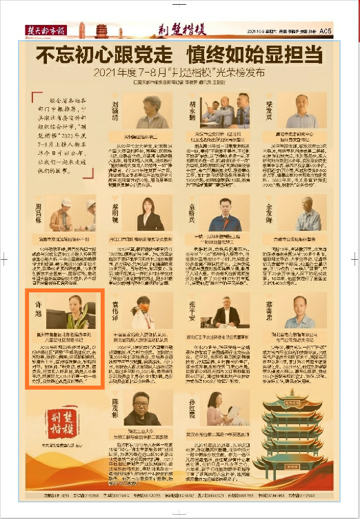 经全省各地各部门申报推荐,中共湖北省委宣传部组织综合评审,“荆楚楷模”2021年度7-8月上榜人物名单今日予以公布,曾都区北郊街道办事处八里岔社区党委书记许旭上榜。