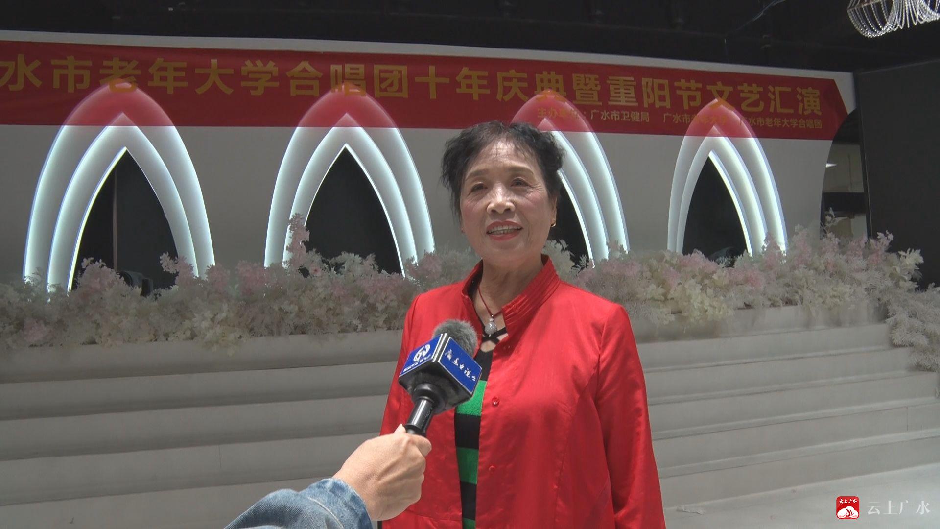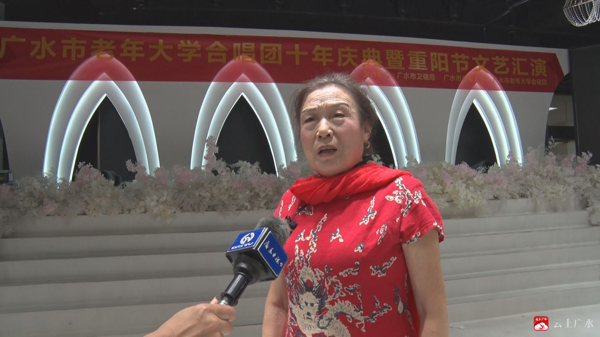 【同期声】广水市老年合唱团团长 黄爱书 今天是我们老年人的节日,九九重阳节,我作为合唱团的一个团长,我把广水市爱好唱歌的歌友,爱好舞蹈的人组织成了一个团,我们经过十年的岁月,我们把大家聚集在一起,为我们的健康,为我们的快乐在老年大学这个平台上,让我们老有所乐,老有所为。让我们永远健康。