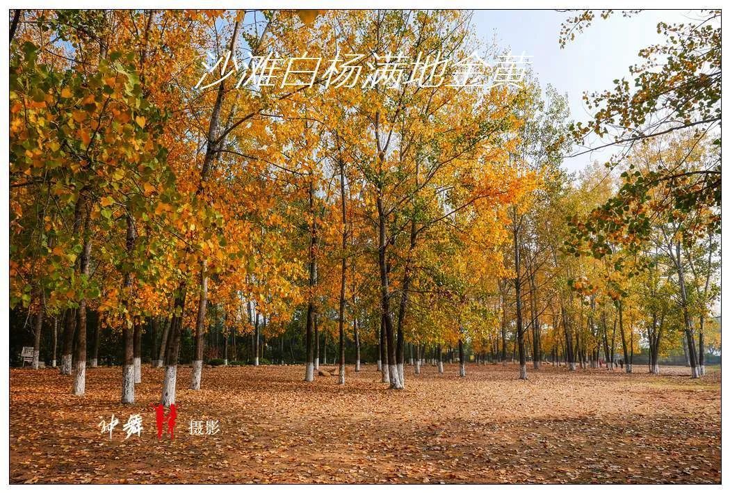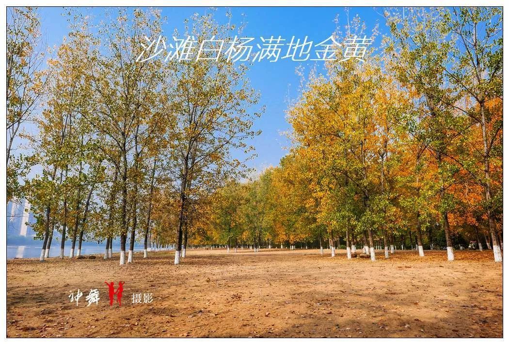 秋天的滨湖体育公园,阳光沙滩上几排高大的白杨树,高耸入云,秋风起处,金黄的树叶片片飘落,铺满一地,很富诗意,任谁走在其中,都会沉醉。