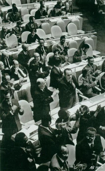 1971年10月25日,第二十六届联合国大会通过决议,恢复中华人民共和国在联合国的一切合法权利。图为决议通过时,会场一片欢腾。