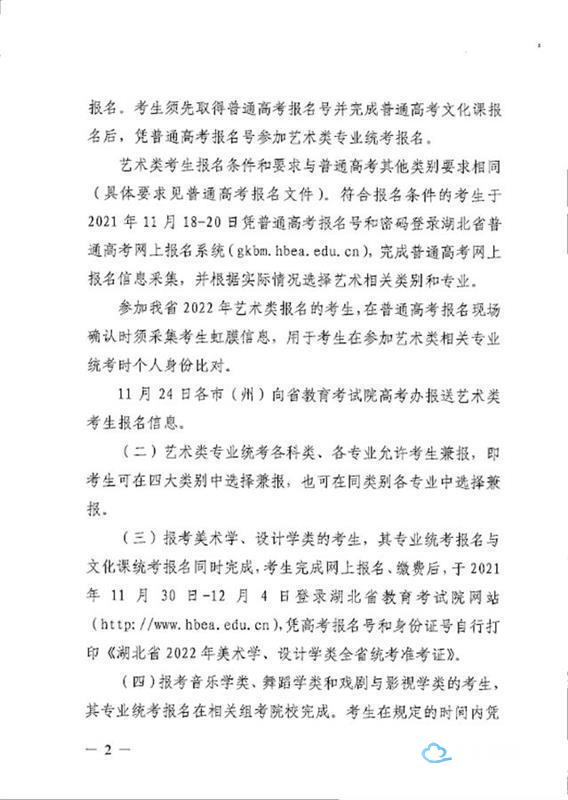 符合报名条件的考生于2021年11月18—20日凭普通高考报名号和密码登录湖北省普通高考网上报名系统,完成普通高考网上报名信息采集,并根据实际情况选择艺术相关类别和专业。