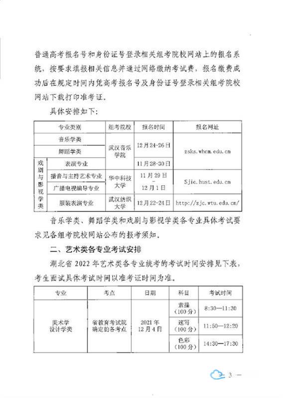 艺术类各专业考试安排在今年12月持续到明年1月。具体报名细则、工作安排及成绩发布等情况,详见省教育考试院官网:(http://www.hbea.edu.cn/html/2021-11/12780.html)