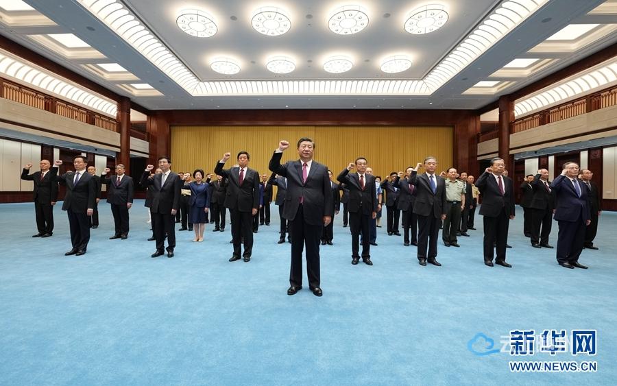 6月18日,党和国家领导人习近平、李克强、栗战书、汪洋、王沪宁、赵乐际、韩正、王岐山等在中国共产党历史展览馆参观“‘不忘初心、牢记使命’中国共产党历史展览”。这是参观结束后,习近平带领党员领导同志一起重温入党誓词。新华社记者 鞠鹏 摄