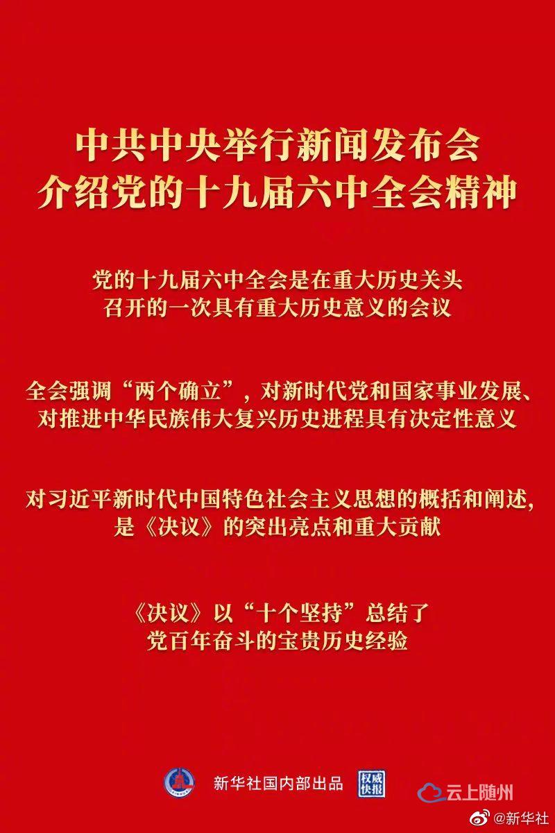 11月12日上午10时,中共中央举行新闻发布会,介绍党的十九届六中全会精神,回答记者问题。发布会介绍:党的十九届六中全会是在重大历史关头召开的一次具有重大历史意义的会议;全会强调“两个确立”,对新时代党和国家事业发展、对推进中华民族伟大复兴历史进程具有决定性意义;对习近平新时代中国特色社会主义思想的概括和阐述,是《决议》的突出亮点和重大贡献;《决议》以“十个坚持”总结了党百年奋斗的宝贵历史经验等。(记者丁小溪,海报设计杨轶群)