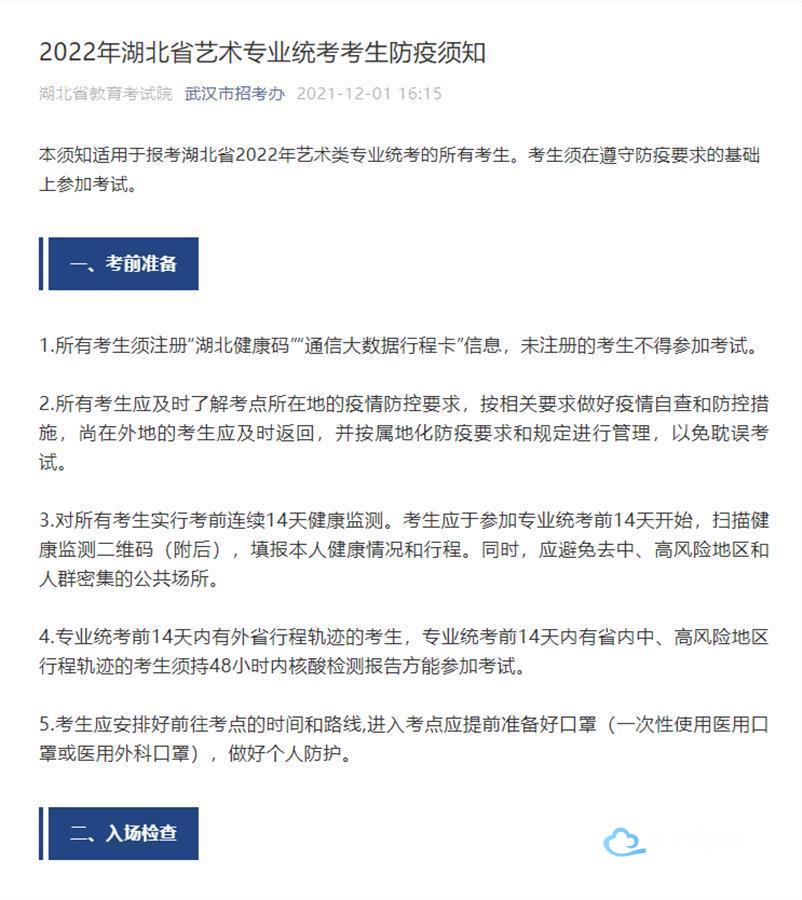 12月4日起,湖北省2022年艺术类专业统考即将陆续开始,湖北省教育考试院与武汉市招考办相继发布重要提醒:根据湖北省新冠肺炎疫情防控规定和艺术专业统考防疫要求,考生进入考点须查验考生本人身份证、准考证、湖北健康码、通信行程卡,考前14天内有外省行程轨迹、省内中高风险地区行程轨迹的考生,还须查验考前48小时内核酸检测阴性证明。