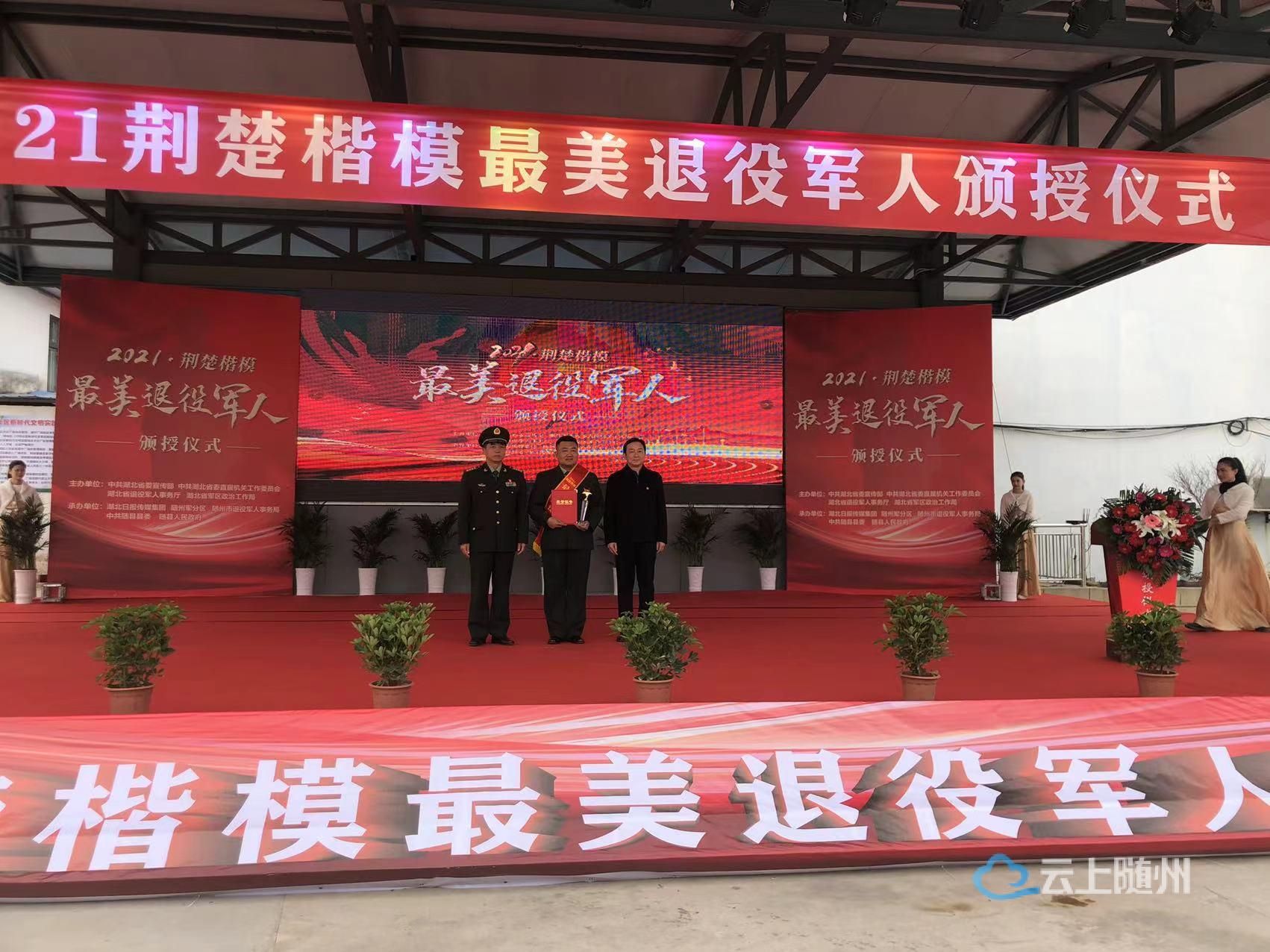12月8日,2021年荆楚楷模最美退役军人颁授仪式在随县灯塔社区文化广场举行,对2021年“荆楚楷模.最美退役军人”获得者,随县退役军人何小军同志进行颁授表彰。