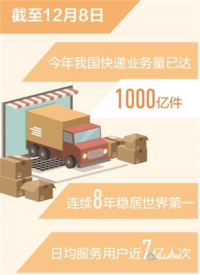 12月8日,国家邮政局快递大数据平台实时监测数据显示:今年我国快递业务量已达1000亿件,这是我国快递年业务量首次超1000亿件,标志着邮政快递业发展又迈上了一个新台阶。近年来,邮政快递业持续抓重点、补短板、强弱项,产业融合日趋紧密,市场活力全面迸发,行业发展取得了长足的进步。