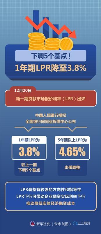 12月20日,最新一期贷款市场报价利率(LPR)出炉。中国人民银行授权全国银行间同业拆借中心公布,1年期LPR为3.8%,相较此前的3.85%下降5个基点,5年期以上LPR为4.65%,保持不变。这是1年期LPR今年内的首次下调,也是2020年4月之后的首次下调。