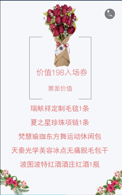 门票是¥198元一张哦,凭这张门票不止是入场凭证!重要的是它还可以刮奖!以下五项商品服务可以随机得到其中两样哦!(绝对100%中奖~)