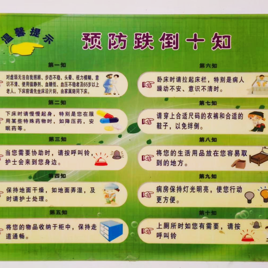 科室针对重点防跌倒患者,在住院一览表、床头卡,以及腕带上均贴有重点防跌倒人群标识,并在每个病房贴有预防跌倒“十知温馨提示”,病房洗手间设置人性化辅助设施,护理人员会根据患者情况动态评估和管理患者跌倒风险等级。夜间为了兼顾患者睡眠和入厕需求,科室在床下贴心设置夜灯,守护患者安心睡眠。
