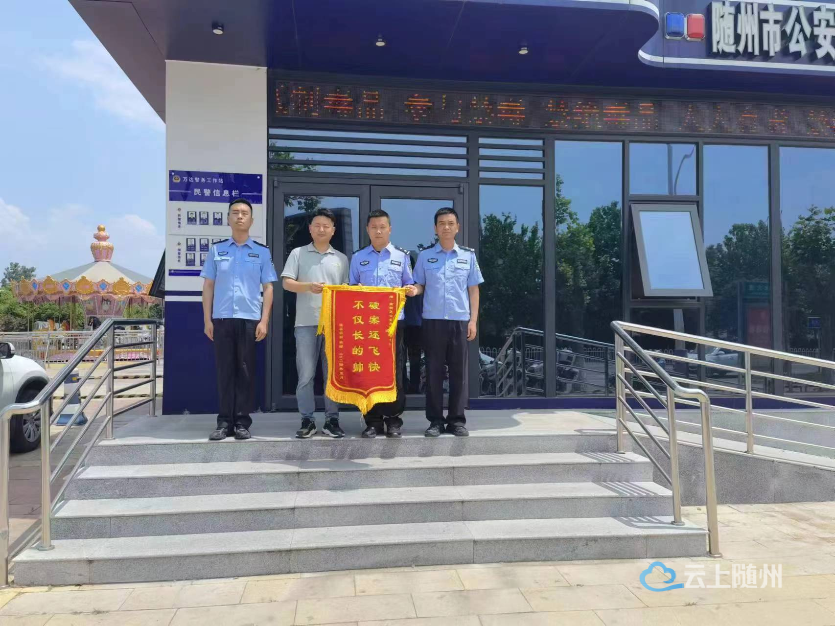 5月20日,市民谢某来到白云湖派出所万达警务站,将一面印有“不仅长的帅 破案还飞快”的锦旗送到民警手中,对民警快速破案,及时挽损表示衷心的感谢。