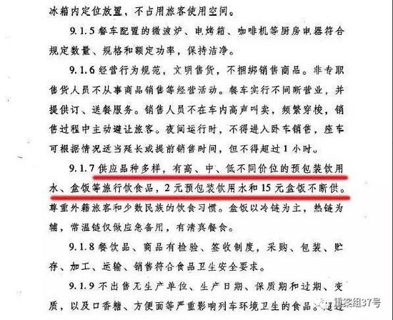 重案组37号(微信ID:zhonganzu37)注意到,2015年1月1日起施行的《铁路旅客运输服务质量规范》中,第九条“列车经营”的“餐饮经营”部分中,明确要求“供应品种多样,有高、中、低不同价位的预包装饮用水、2元预包装饮用水和15元盒饭不断供”。