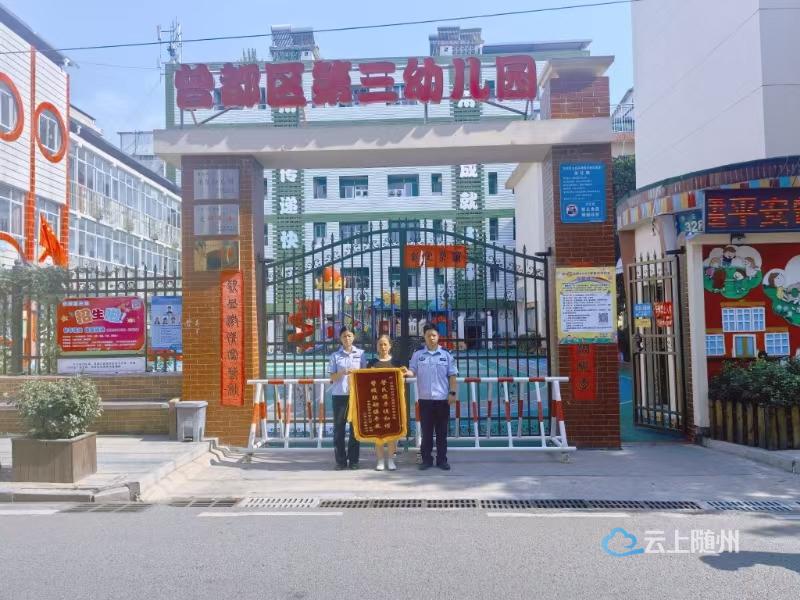 7月7日,曾都区第三幼儿园的老师,将一面绣有 “警民携手促和谐 警校联动保平安” 的锦旗送到西城九曲弯社区,对社区长期以来深入校园开展安全教育活动、守护师生安全的暖心举动表示衷心感谢。