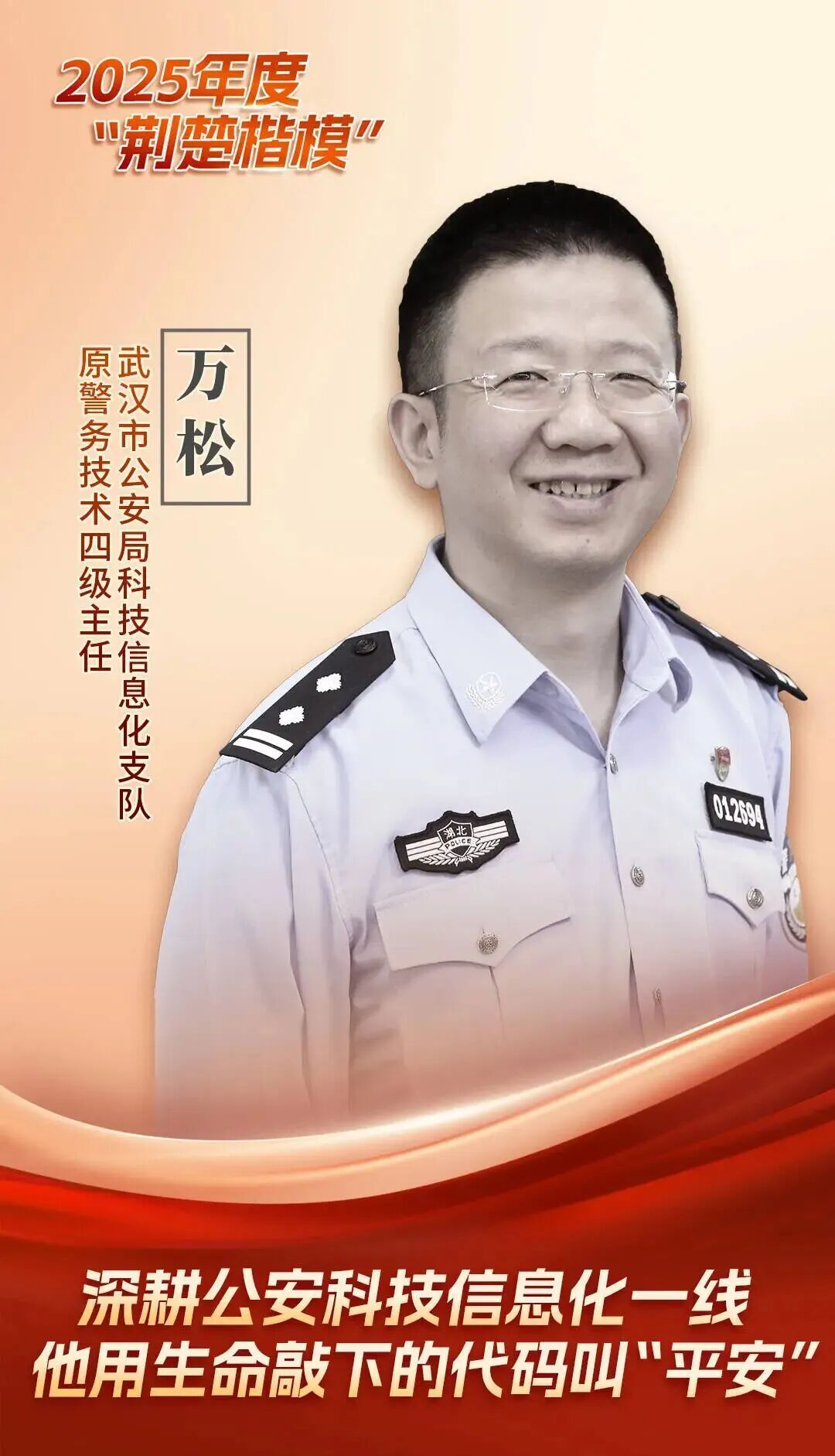 万松同志28年如一日,深耕公安科技领域,带领团队深入开展110余项专项研判工作,牵头研发26个实战数据平台,为武汉公安智慧警务体系建设作出突出贡献。2025年5月26日13时许,万松同志在组织完端午节安保风险研判后突发疾病,经送医抢救无效,于5月27日凌晨牺牲,年仅50岁。参警28年来,万松支撑协破全市重特大案件160余起,先后荣立个人一等功1次、个人三等功5次,受到政府嘉奖2次,曾获评“全省优秀共产党员”“武汉市优秀共产党员”“武汉市先进工作者”。