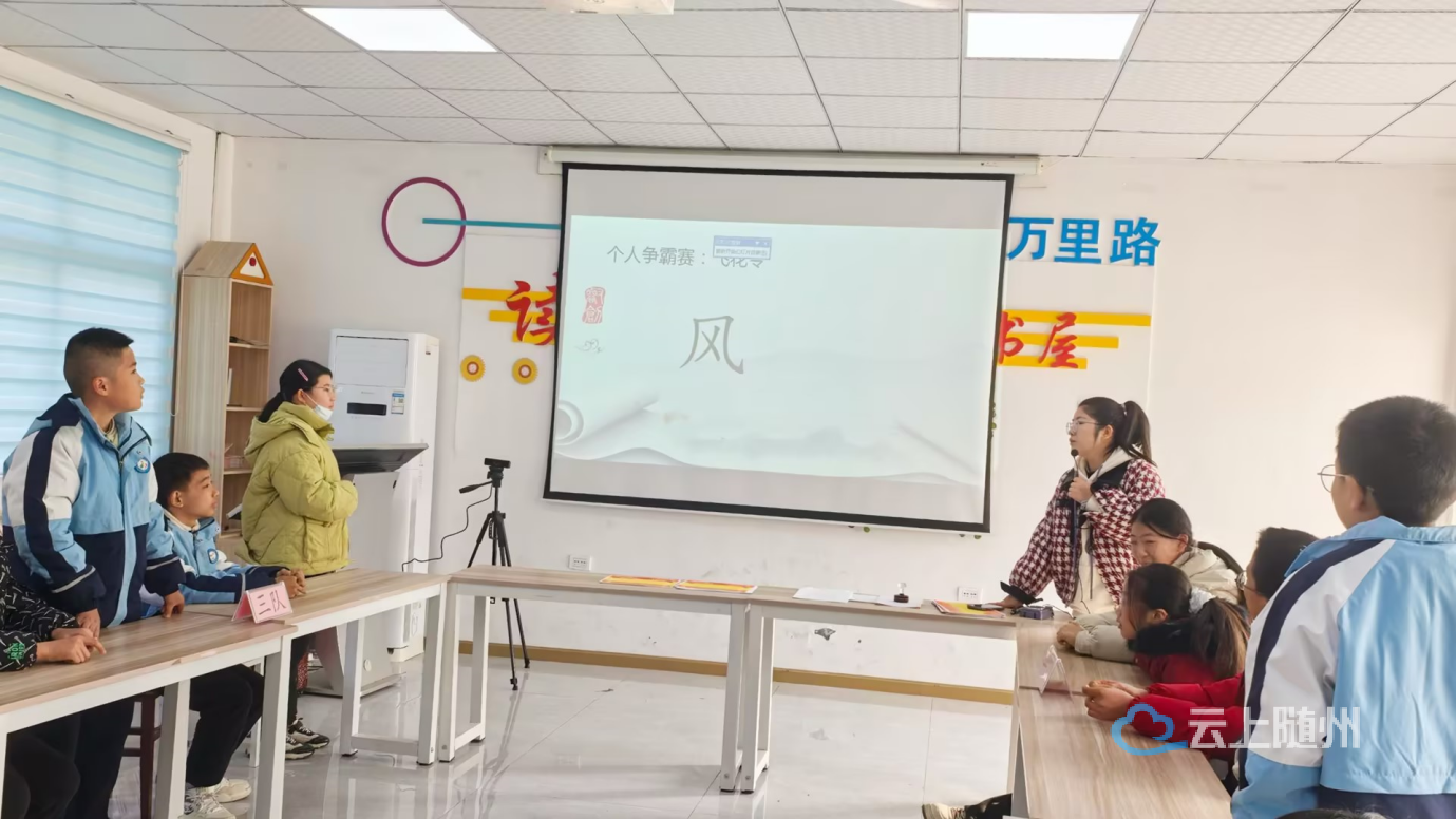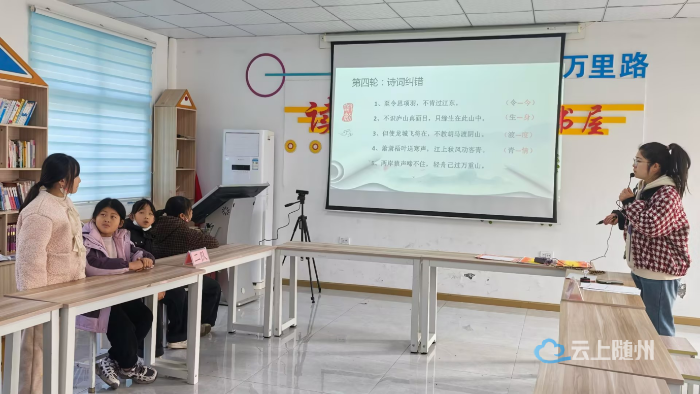 本次诗词大会聚焦教材内必背古诗,兼顾团体协作与个人风采,分为班级团体必答题和个人争霸赛两大环节。团体必答题环节中,各班4名选手依次登台,分别挑战“腹有诗书”“行云流水”“火眼金睛”“诗词纠错”四大模块,从完整背诵、上下句对接,到九宫格识句、错别字修正,全方位检验古诗积累的熟练度与精准度。选手们沉着应答、默契配合,时而从容背诵千古名篇,时而快速精准纠错,展现出扎实的诗词功底,现场掌声此起彼伏。