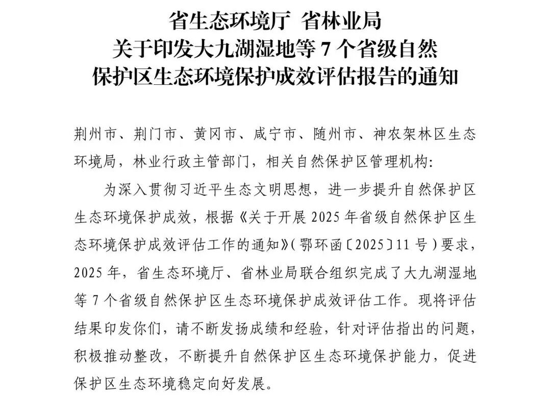 《关于大九湖湿地等7个省级自然保护区生态环境保护成效评估报告的通知》
