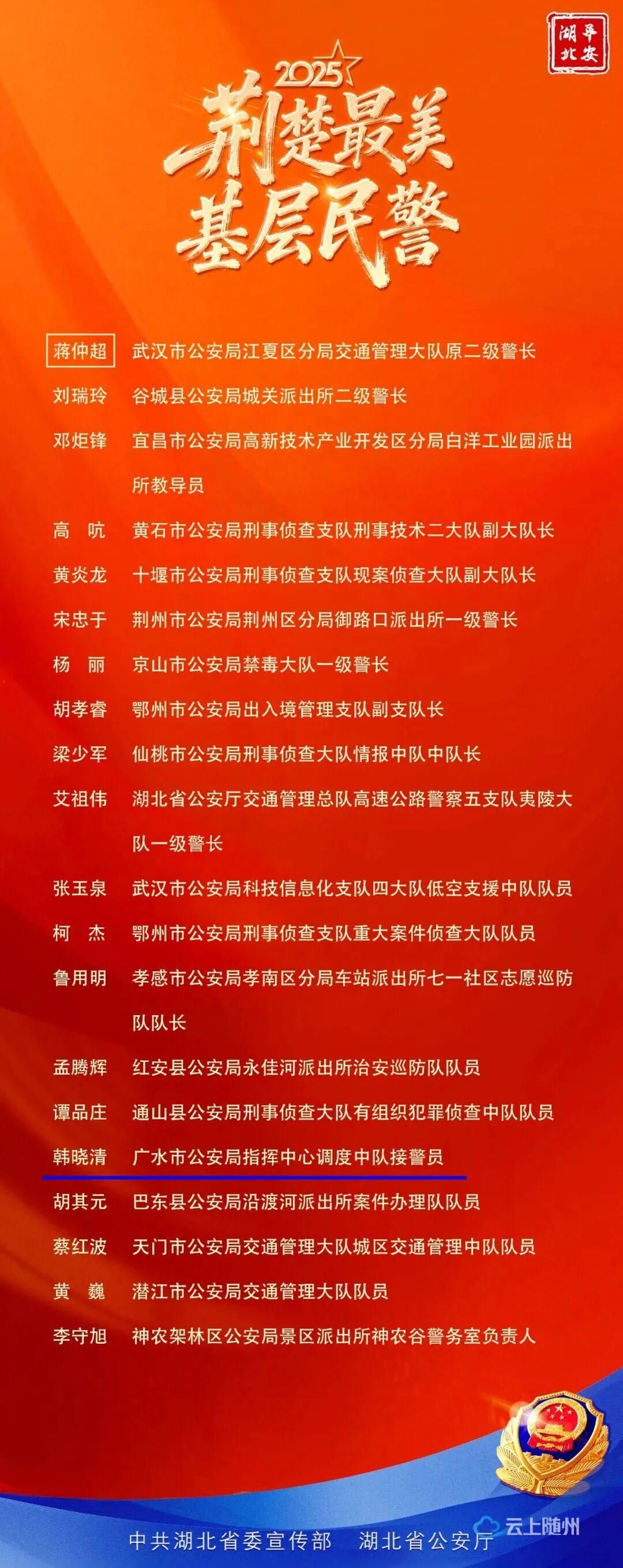 近日,2025“荆楚最美基层民警”名单正式揭晓,广水市公安局指挥中心调度中队接警员韩晓清名列其中,成为本次评选活动中来自基层警务辅助岗位的优秀代表之一。