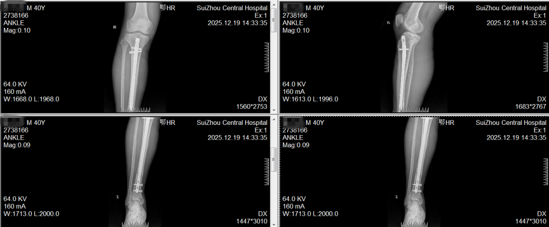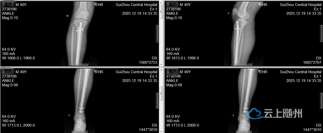 一位中年人在运动中小腿骨折,我们通过微创放入髓内钉从内部进行固定。手术只有几个小锁孔,不伤及周围软组织,疤痕不明显,他能更早开始康复锻炼,更快回到工作和运动中去。