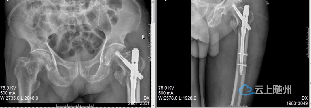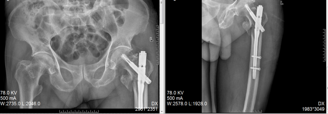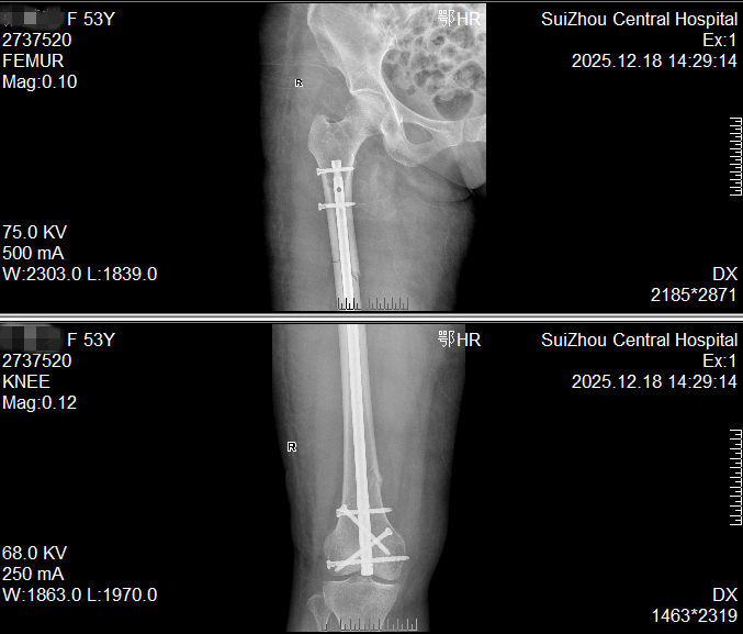 一位53女士大腿多处骨折,甚至影响到膝盖。我们仅在膝盖上方开一个约4厘米的小口,放入一根髓内钉将骨折处全部连接固定。这样既保护了腿部血流和肌肉,也为后期膝盖活动打下了好基础。