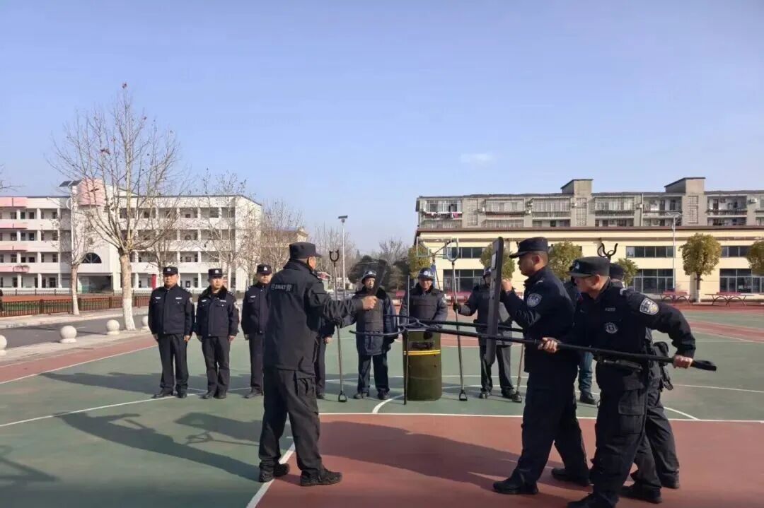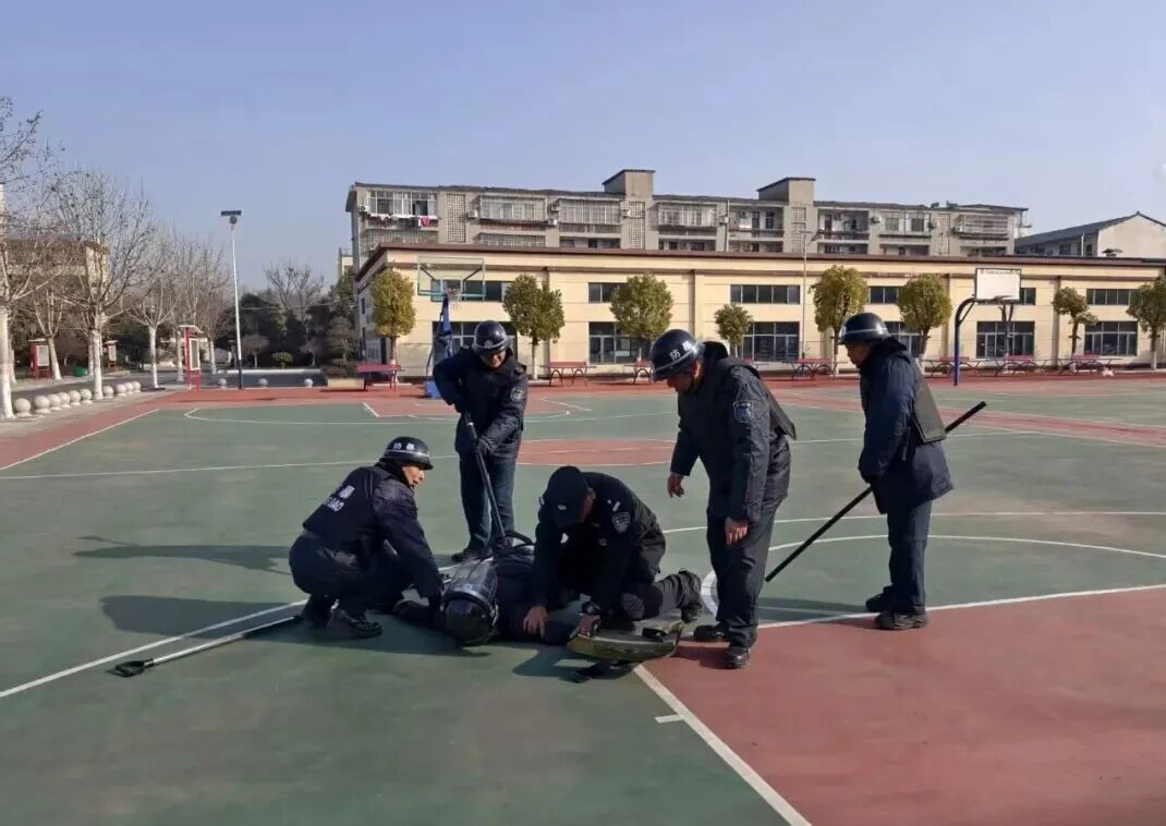 演练前,民警结合校园安全工作实际,围绕校园内可能出现的突发事件,向学校安保人员详细讲解了钢叉、盾牌、警棍等安防器械的正确使用方法,以及面对突发情况时的处置流程、人员配合技巧和自身防护要点。民警通过现场演示、动作拆解的方式,将理论知识与实操技能相结合,让安保人员直观掌握应急处置的核心要点。