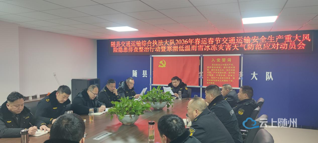 2026年春运即将开始,最强寒潮同期抵达。面对保畅与抗冰的双重压力,1月19日,随县交通运输综合执法大队迅速召开专题部署会,坚持“人民至上、安全第一”,全面启动春运安全风险排查整治工作,并紧急动员应对寒潮天气,全力守护群众平安温暖回家路。