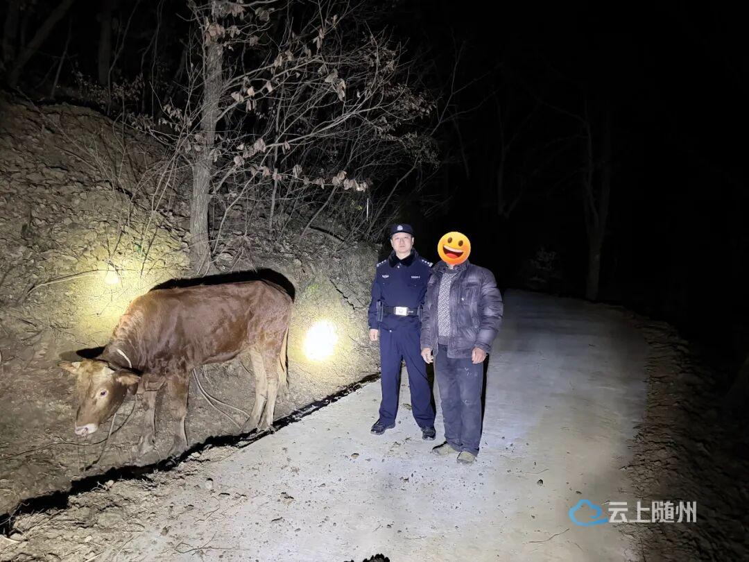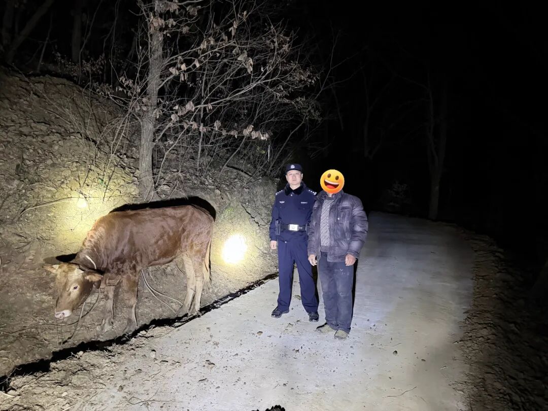 功夫不负有心人,1月16日19时许,在张某家附近林地发现走失黄牛。“太感谢你们了!”见到失而复得的黄牛,张某激动致谢。民警同步叮嘱其加强家畜看管,避免类似情况发生。