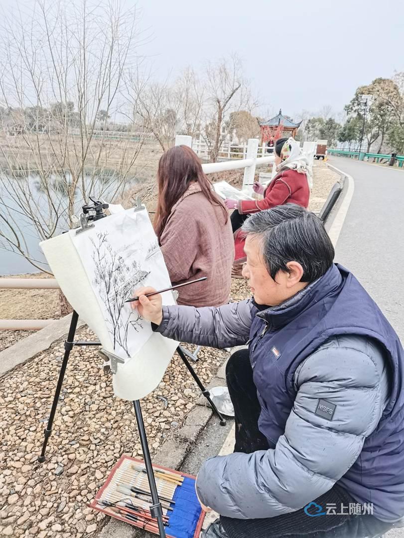 薄雾轻笼碧水,暖阳映照栈道,露营平台与临水木屋构成天然画卷,数十位省、市级画家、书法家、诗词楹联会员,于山水之畔,用笔墨丹青绘就广水生态之美与人文之韵美丽画卷。