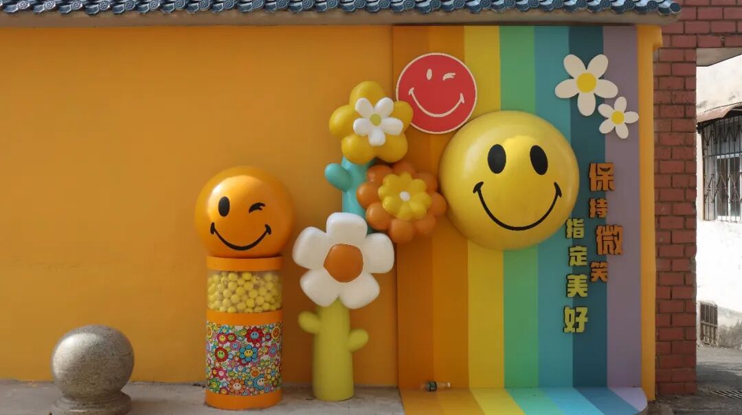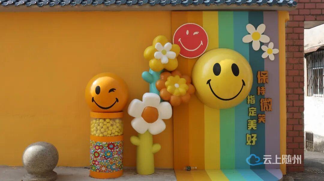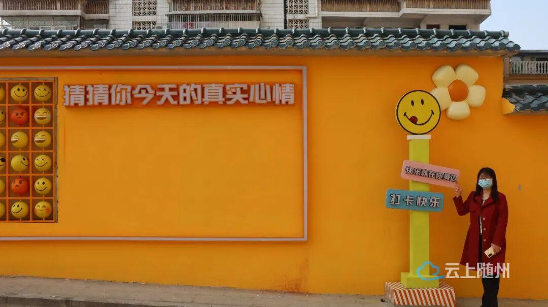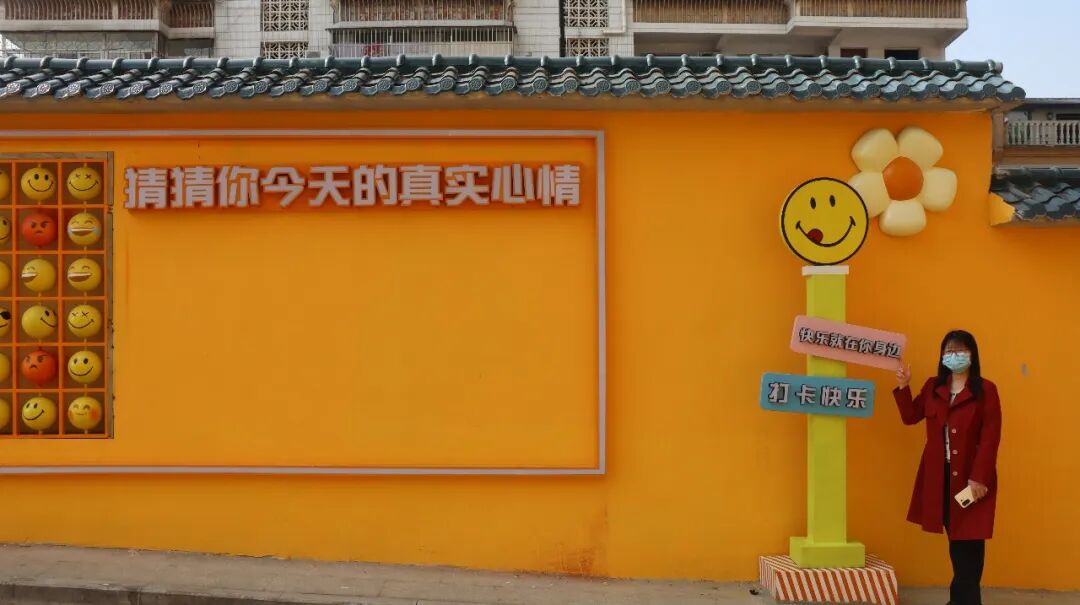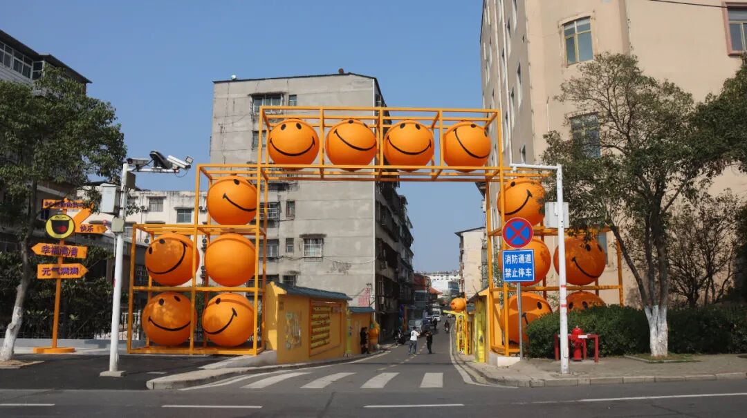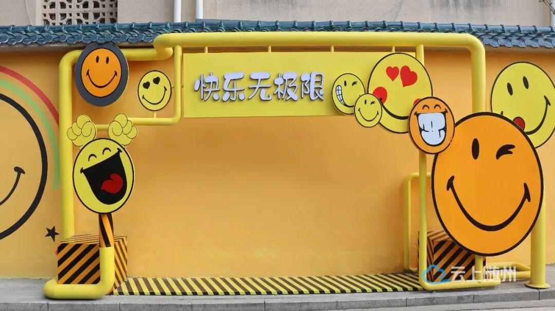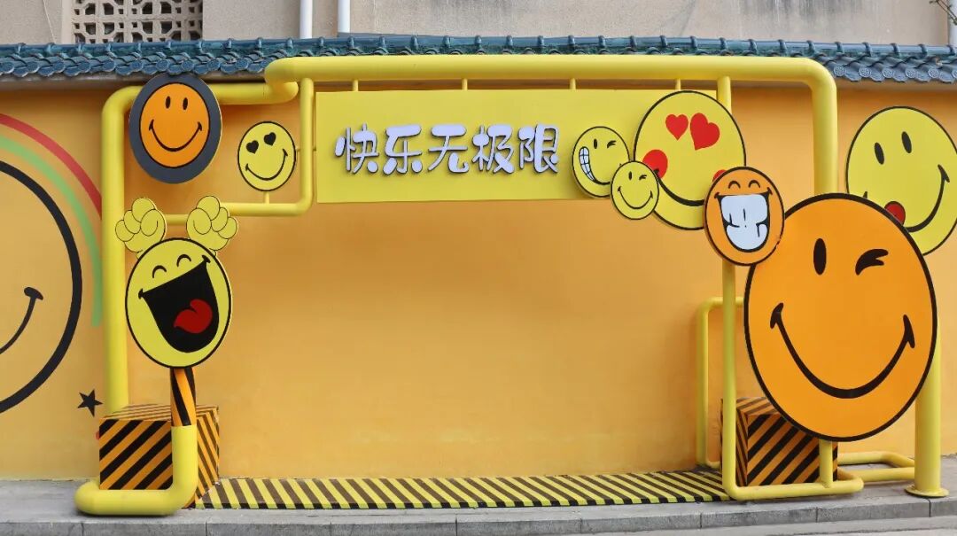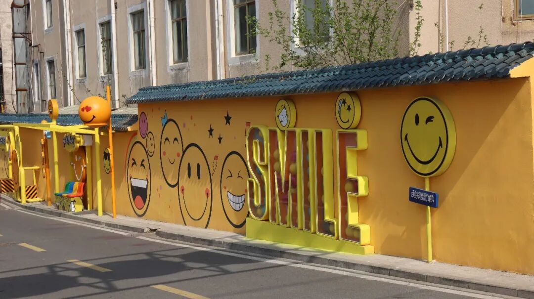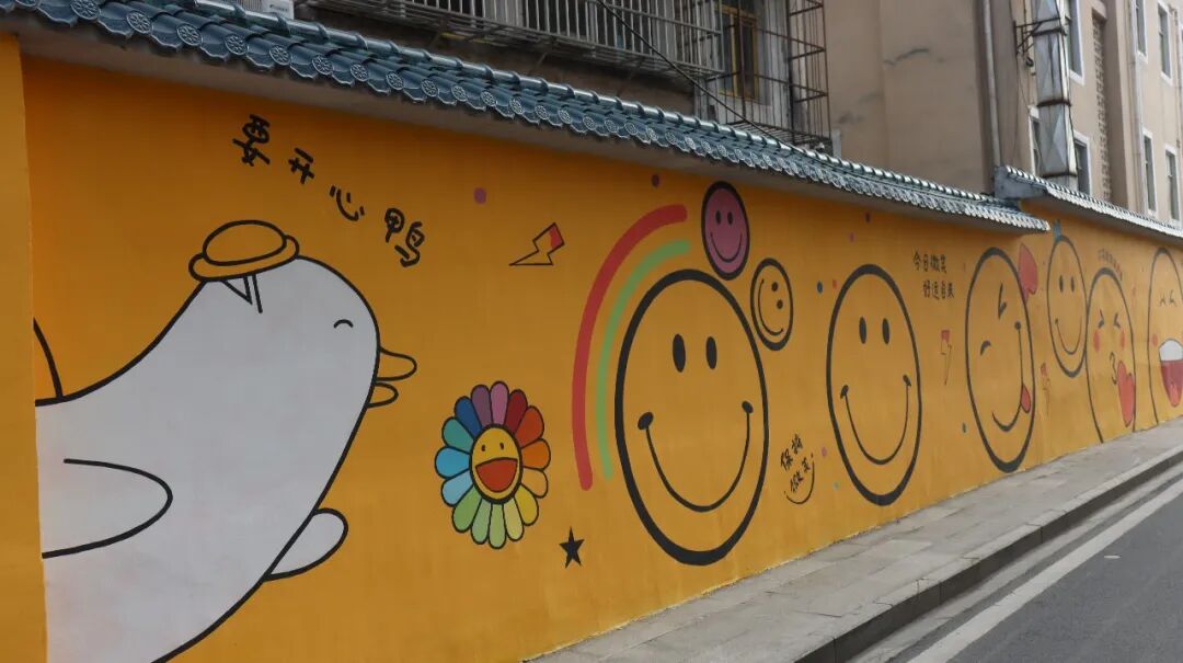 沿河大道白云湖社区入口处,一面200米长的互动彩绘墙悄然走红。明亮的黄色墙壁上画满了卡通表情和“快乐就在你身边”“快乐无极限”等趣味标语,午后的阳光洒在墙面上光影斑驳,傍晚路灯亮起时氛围感十足,不少市民专程前来打卡。