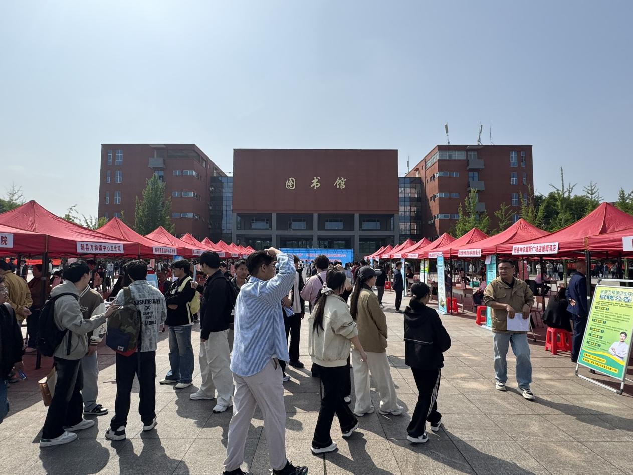 4月25日,由随县人力资源和社会保障局、随州职业技术学院联合主办,随县人才交流服务中心、随州市人才集团承办的“才智相‘随’·共建支点·百县进百校联万企”——2026年随州职业技术学院专场招聘会在学校图书馆广场举行。活动聚焦高校毕业生就业需求,深入推进校地校企精准对接,为用人单位和毕业生搭建双向选择平台,取得良好成效。