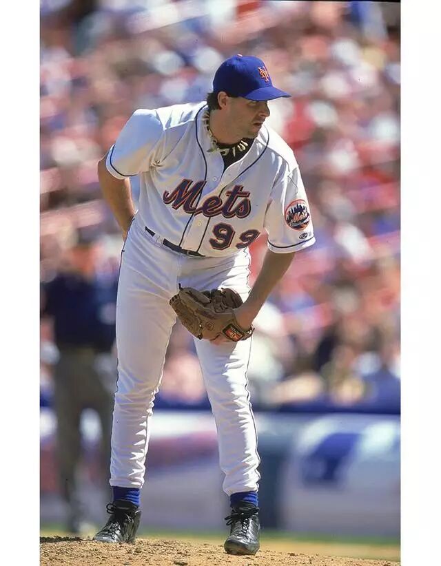投手丘上的迷信:特克·温德尔(Turk Wendell)在1993到2004年间是美国职业棒球联盟的一位投球手,他用来祈求好运气的办法比巫医还要多。他的幸运魔法包括佩戴一条用他猎获的动物的牙齿做成的项链,和在投手丘上画三个十字架。(图片来源:Jamie Squire/Allsport)